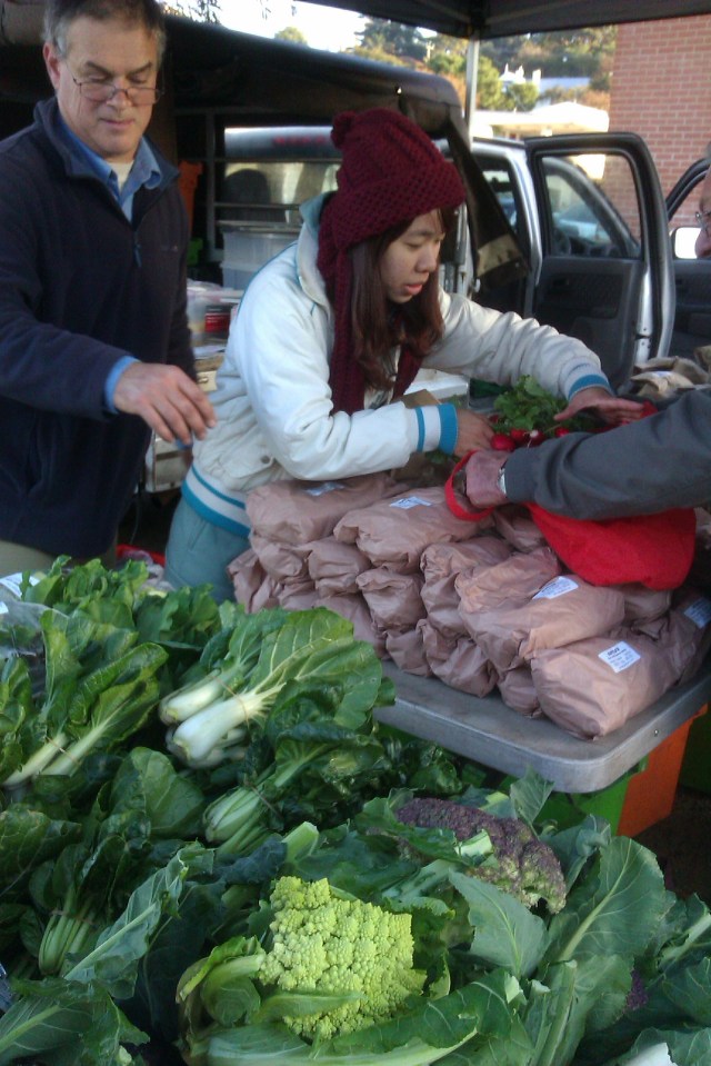 Lin, new arrival from Taiwan helping Andrew at Albany Farmers Market