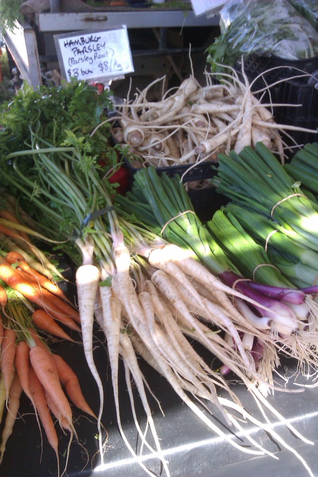 Carrots, Hambug parsley and salad onions for sale at the market